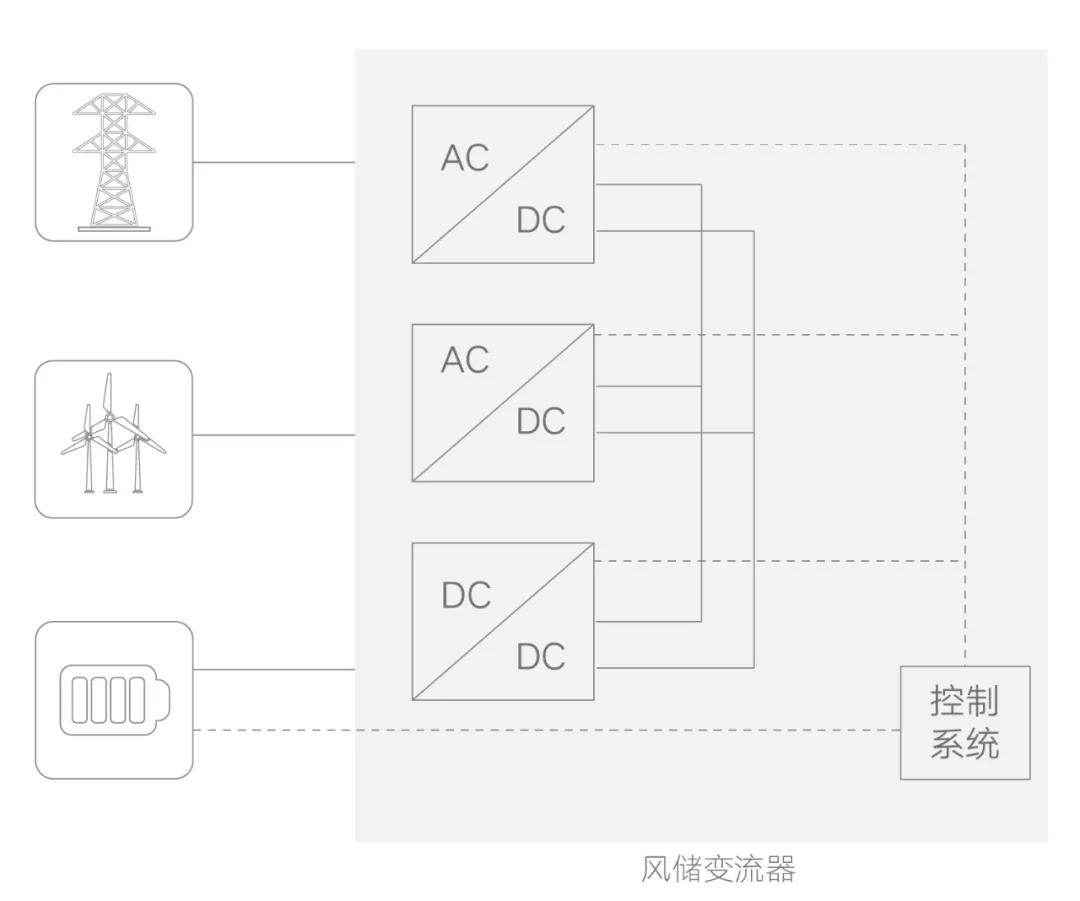 2021年CWP國(guó)際風(fēng)能展中,陽光電源發(fā)布風(fēng)儲(chǔ)一體變流器,該變流器由6.6MW雙饋風(fēng)電變流器直流側(cè)配比10%功率的儲(chǔ)能變流單元,通過風(fēng)電變流與儲(chǔ)能變換一體化控制,深度融合風(fēng)電變流與儲(chǔ)能功能的場(chǎng)景化應(yīng)用。