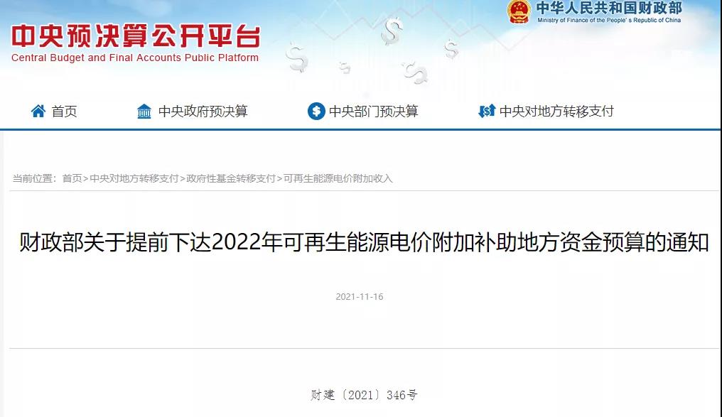 北極星風(fēng)力發(fā)電網(wǎng)訊:11 月 16日,中央預(yù)算公共平臺(tái)發(fā)布“關(guān)于提前下達(dá)2022年可再生能源電價(jià)附加補(bǔ)助地方資金預(yù)算的通知”。根據(jù)通知,本次下達(dá)總計(jì)新能源補(bǔ)貼資金38.7億元。其中,風(fēng)電15.5億元、光伏22.8億元、生物質(zhì)3824萬(wàn)元。