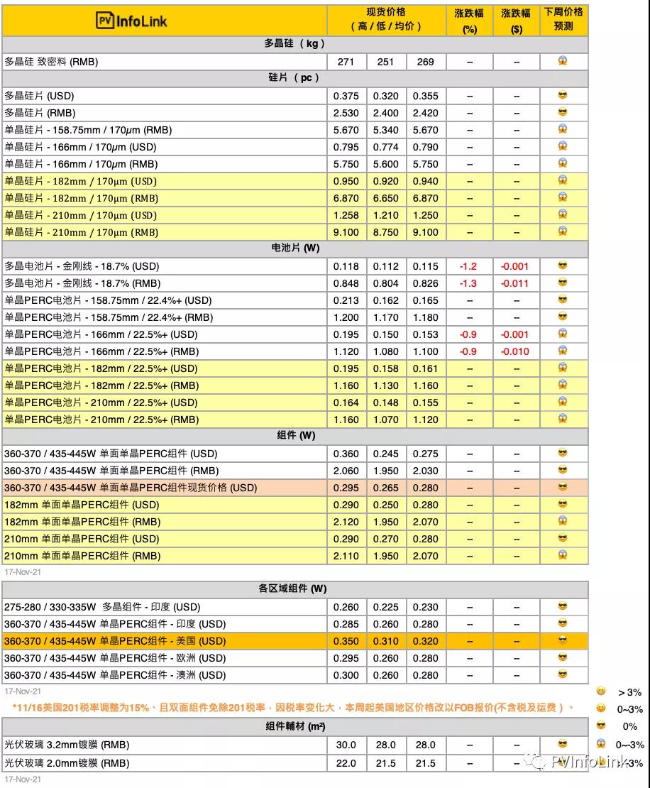 11/16美國201稅率調(diào)整為15%、且雙面組件免除201稅率,因稅率變化大,本周起美國地區(qū)價格改以FOB報價(不含稅及運費)。