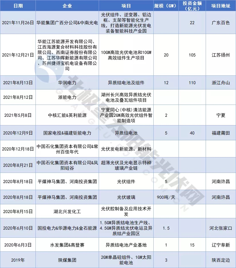 除華能外,2021年8月,華潤(rùn)電力12GW高效異質(zhì)結(jié)太陽能電池及組件制造項(xiàng)目在浙江舟山開工,根據(jù)投資方計(jì)劃,項(xiàng)目將分4期建設(shè),一期項(xiàng)目預(yù)計(jì)一年后建成達(dá)產(chǎn)。