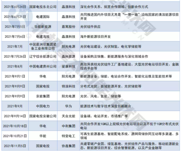 據(jù)不完全統(tǒng)計(jì),僅2021年,隆基、天合、晶澳、晶科、陽光電源、華為等18家制造企業(yè)與央國(guó)企簽訂戰(zhàn)略合作,合作內(nèi)容涵蓋設(shè)備供應(yīng)、光伏項(xiàng)目合作開發(fā)等。