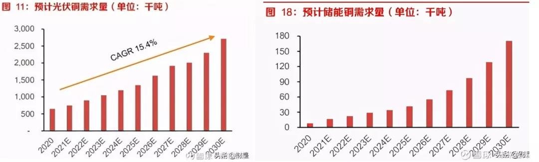 據(jù)某機(jī)構(gòu)預(yù)測(cè),銅在風(fēng)電、新能源汽車、光伏和儲(chǔ)能的需求量在2020、2025和2030年合計(jì)或達(dá)137、318和609萬(wàn)噸。以2020年為基,銅增量需求在2025年、2030年將達(dá)181和472萬(wàn)噸,約占2020年全球銅消費(fèi)量的7%和19%。
