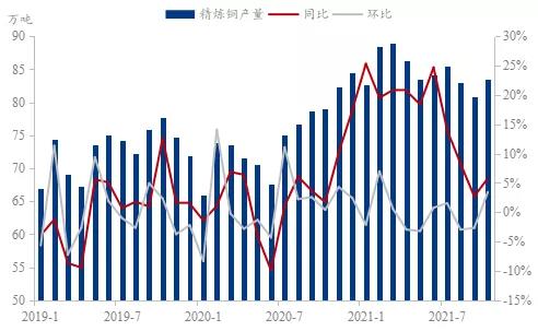 據(jù)Mysteel統(tǒng)計(jì),2021年中國(guó)精煉銅產(chǎn)量累計(jì)1020萬(wàn)噸,同比增長(zhǎng)3.3%。預(yù)計(jì)2022年中國(guó)精煉銅產(chǎn)量增長(zhǎng)40萬(wàn)噸至1060萬(wàn)噸,同比增長(zhǎng)3.9%。