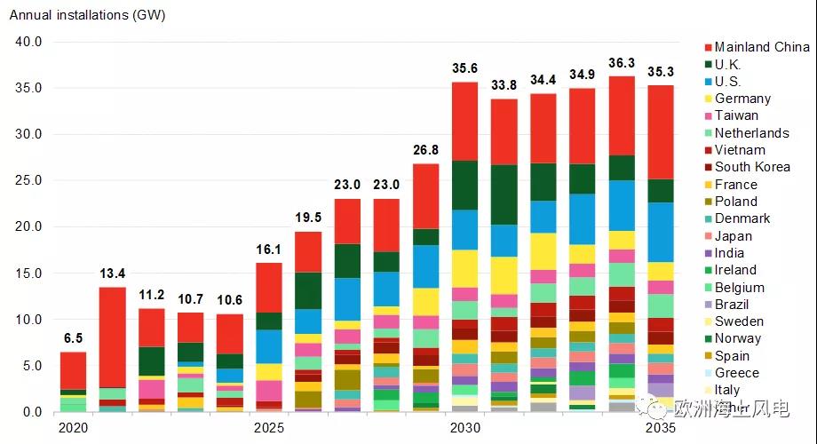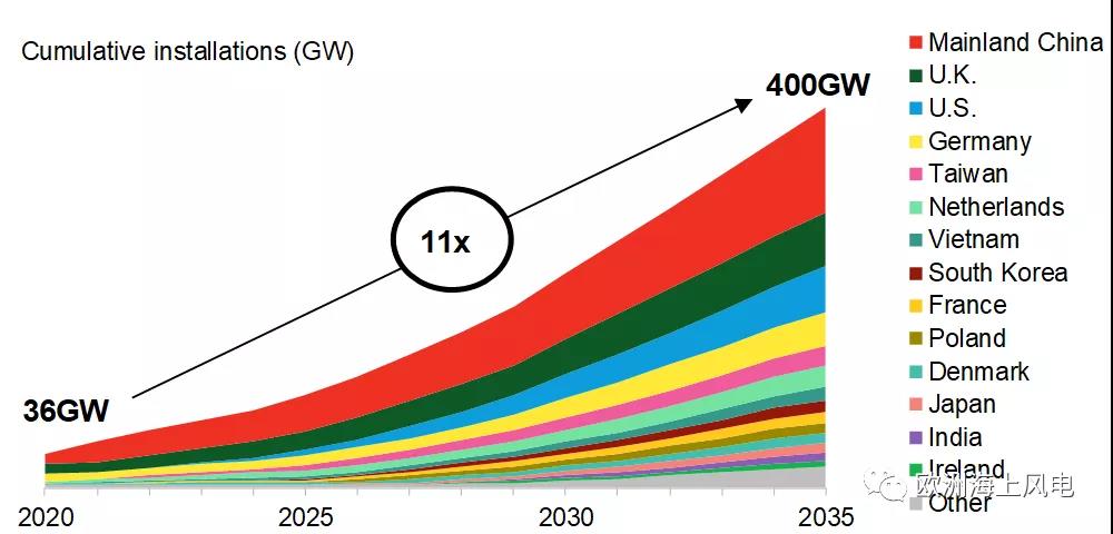 據(jù)彭博新能源預(yù)測(cè),到2035年,全球海上風(fēng)電累計(jì)裝機(jī)將到到400GW,和2020年36GW的裝機(jī)相比增長11倍。中國大陸、英國、美國、德國、荷蘭將位居前五。(注:本文數(shù)據(jù)為BNEF統(tǒng)計(jì),中國大陸有關(guān)數(shù)據(jù)可能與國家能源局后期發(fā)布數(shù)據(jù)有出入,但其它國家和地區(qū)裝機(jī)準(zhǔn)確度較高,具有更高參考價(jià)值。)