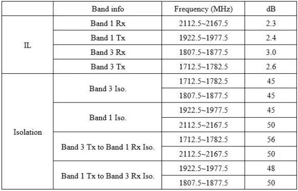 表1 信唐智芯Band 1+ Band 3混合型四工器主要測試性能
