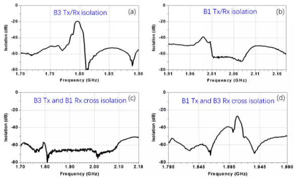 圖3 信唐智芯Band 1+ Band 3混合型四工器測試結(jié)果圖。(a)B3 Tx/Rx隔離圖;(b)B1 Tx/Rx隔離圖;(c)B3 Tx和B1 Rx隔離圖;(d)B1 Tx和B3 Rx隔離圖。