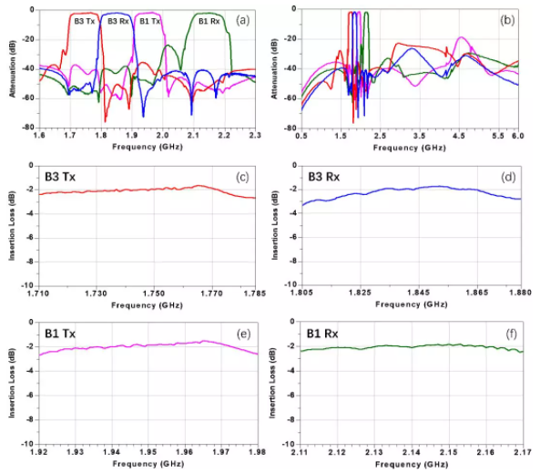 圖2 信唐智芯Band 1+ Band 3混合型四工器測試結(jié)果圖。(a)四工器S21測試窄帶圖;(b)四工器S21測試寬帶圖;(c)B3 Tx插損圖;(d)B3 Rx插損圖;(e)B1 Tx插損圖;(f)B1 Rx插損圖。