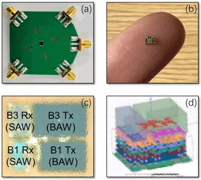 據(jù)麥姆斯咨詢報道,近日,浙江信唐智芯科技有限公司正式發(fā)布其自主研發(fā)成功的混合型Band 1+Band 3四工器。據(jù)介紹,這次發(fā)布的混合型四工器為國內(nèi)首創(chuàng),集成了信唐智芯先進的BAW、SAW、超厚層PCB整合、混合封裝、干擾消除、功率增強、諧波抑制等多項創(chuàng)新技術(shù)。其中Band 1和Band 3發(fā)射濾波器采用了BAW濾波器技術(shù),接收濾波器采用了SAW濾波器技術(shù)(參見圖1)。