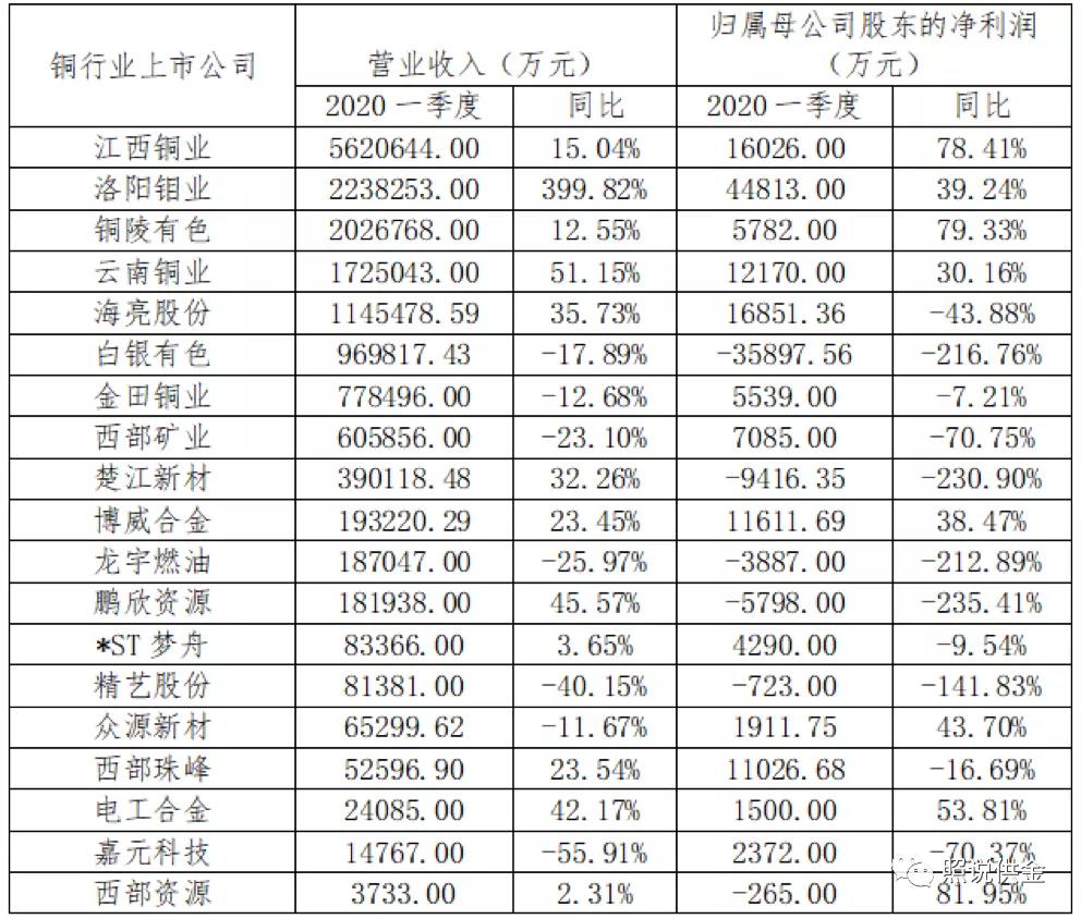2020年初新冠疫情對銅行業(yè)企業(yè)的生產(chǎn)經(jīng)營產(chǎn)生造成了一定影響,銅金屬價格跌幅較大,近半銅行業(yè)上市公司一季度營業(yè)收入和凈利潤較上年同期有所下降。