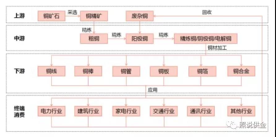 銅產(chǎn)品的生產(chǎn)過程分為銅礦采選、銅冶煉、銅材加工三個環(huán)節(jié),根據(jù)銅產(chǎn)品生產(chǎn)環(huán)節(jié)對銅產(chǎn)業(yè)鏈進(jìn)行劃分,可分為上游的銅礦山企業(yè)、中游的銅冶煉企業(yè)和下游的銅材加工企業(yè)。