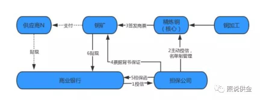 除票據(jù)池業(yè)務(wù)外,商業(yè)銀行還可以選擇引入擔(dān)保公司模式介入銅產(chǎn)業(yè)鏈核心企業(yè)?;谏虡I(yè)銀行對擔(dān)保公司的授信額度,擔(dān)保公司可對銅產(chǎn)業(yè)鏈的核心企業(yè)進(jìn)行主動授信,進(jìn)行白名單管理,由精煉銅企業(yè)對外簽發(fā)商票支付,上游企業(yè)收到核心企業(yè)承兌的商票,可以背書支付,也可選擇與擔(dān)保公司簽訂擔(dān)保協(xié)議,由擔(dān)保公司對商票進(jìn)行背書保證,完成保證動作后,可向商業(yè)銀行申請商票融資,商業(yè)銀行基于擔(dān)保公司授信及其出具的擔(dān)保函,對上游企業(yè)放款。