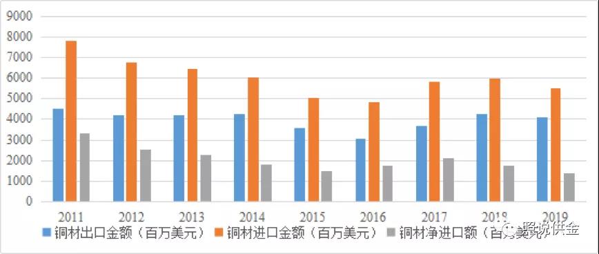 從進(jìn)出口貿(mào)易情況來看,2011-2019年來,我國銅材一直呈現(xiàn)貿(mào)易逆差狀態(tài)。2011年凈進(jìn)口額達(dá)到了3302.47百萬美元,之后有所下降,出口額則較為穩(wěn)定。2019年銅材出口金額4114.95百萬美元,進(jìn)口金額為5482.15百萬美元,凈進(jìn)口額為1367.20百萬美元。