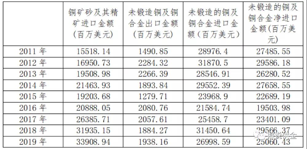 表2 2011-2019年銅礦砂及其精礦、未鍛造銅及銅合金進(jìn)出口情況統(tǒng)計
