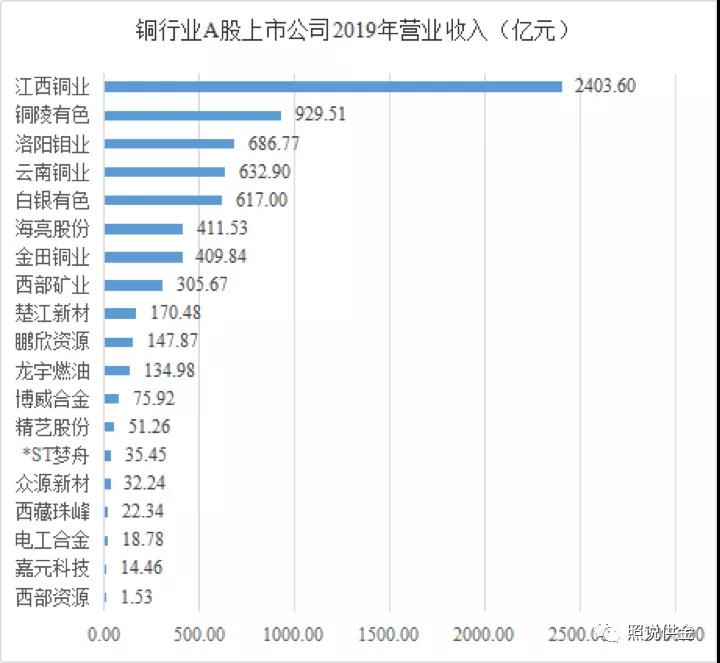 其中,以絕對優(yōu)勢占領(lǐng)銅行業(yè)龍頭的江西銅業(yè)營業(yè)收入2403.6億元,占19家公司總收入的三分之一,銅陵有色和洛陽鉬業(yè)分別以929.51億元和686.77億元位列第二、三位。