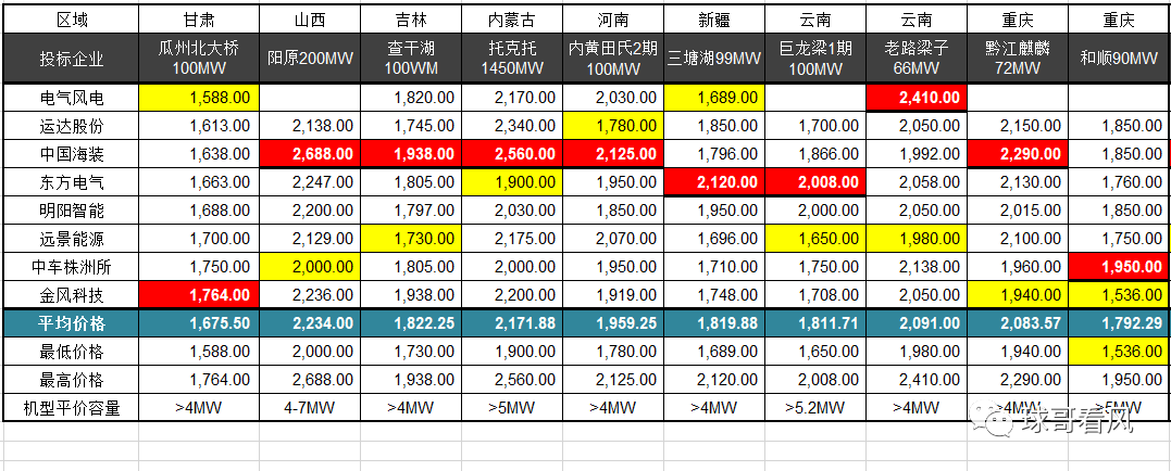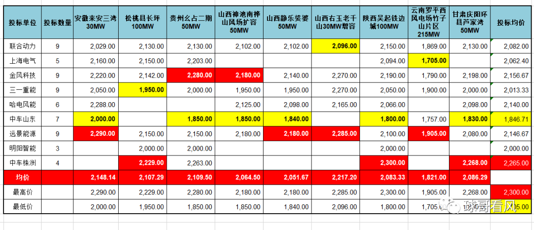 一共9個項目,包括新增和擴容兩種。在這9個項目里,山東中車、聯(lián)合動力、三一重能、電氣風(fēng)電分別報6、1、1、1次最低價。山東中車發(fā)力明顯。這9個項目中,最低投標(biāo)報價折合單價為電氣風(fēng)電的1705元/kW。項目投標(biāo)平均折合單價在1821元/kW-2217元/kW之間。