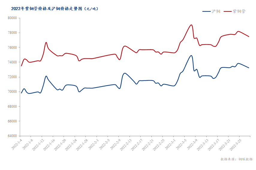 本月,銅價(jià)走勢(shì)以震蕩上行為主,但是隨著銅價(jià)的走高,盤中多次沖高回落。但目前市場(chǎng)的不確定性較大,首先是俄烏的局勢(shì)目前仍然緊張,歐美對(duì)俄方的制裁逐步升級(jí),但在國(guó)內(nèi)釋放的穩(wěn)增長(zhǎng)、穩(wěn)金融政策以及海外面臨通脹的大環(huán)境下,對(duì)有色金屬價(jià)格還是具有部分支撐,滬銅價(jià)格延續(xù)高位震蕩走勢(shì)。其次國(guó)內(nèi)的疫情管控,新冠疫情在國(guó)內(nèi)繼續(xù)擴(kuò)散,各地的嚴(yán)格管控措施也在繼續(xù)升級(jí)。目前疫情對(duì)于物流運(yùn)輸造成較大的影響,銅管企業(yè)的產(chǎn)成品庫(kù)存也難以運(yùn)送,而原材料供應(yīng)也受到限制。銅管價(jià)格隨銅價(jià)區(qū)間調(diào)整,價(jià)格上漲下游市場(chǎng)反饋本月銅管市場(chǎng)消費(fèi)低迷,需求表現(xiàn)不及去年同期。