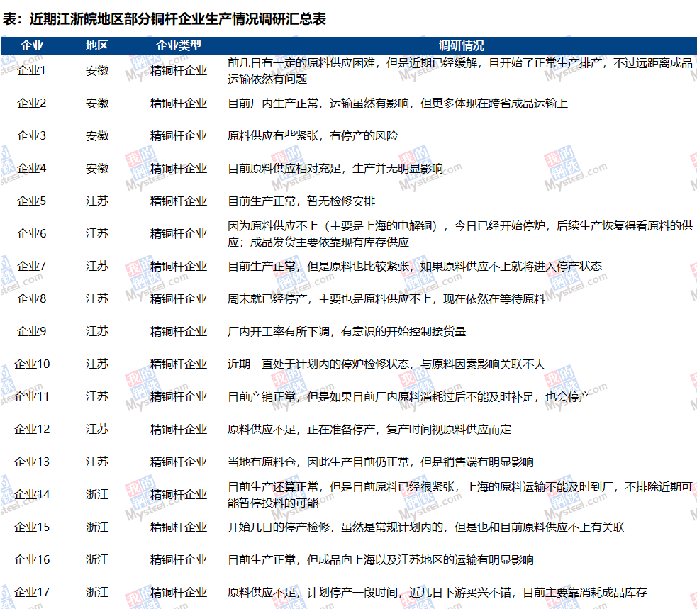 近來由于上海地區(qū)區(qū)域內(nèi)的疫情管控以及市場(chǎng)倉儲(chǔ)提貨發(fā)貨受限,造成了周邊地區(qū)精銅桿生產(chǎn)企業(yè)原料供應(yīng)不足,部分企業(yè)在原料供應(yīng)短缺的影響下進(jìn)入減產(chǎn)、停產(chǎn)狀態(tài),Mysteel銅桿團(tuán)隊(duì)就此對(duì)江浙皖一帶銅桿企業(yè)進(jìn)行了調(diào)研,具體調(diào)研結(jié)果如下: