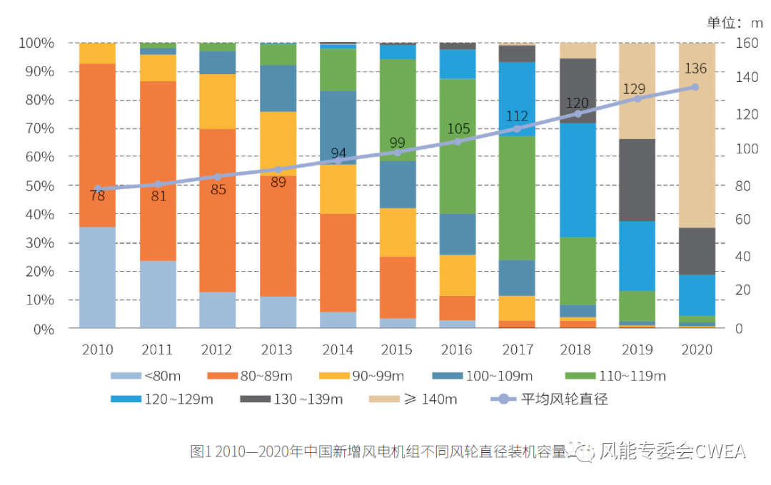 圖1 2010—2020年中國(guó)新增風(fēng)電機(jī)組不同風(fēng)輪直徑裝機(jī)容量占比