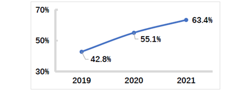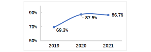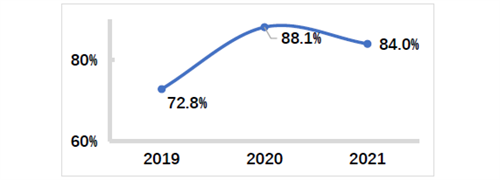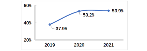 2021年,我國光伏新增裝機量、分布式裝機量、戶用裝機量以及分布式裝機在總裝機量中的占比均創(chuàng)歷史新高。我國光伏新增裝機54.88GW,同比增長13.9%,其中,分布式裝機約29.28GW,占全部新增裝機的53.4%,歷史上首次突破50%。2021年戶用裝機達21.6GW,同比增長113.3%,占2021年我國新增光伏裝機的39.4%。光伏發(fā)電量3259億千瓦時,同比增長25.1%,全國利用小時數(shù)1163小時,同比增加3小時,光伏發(fā)電利用率98%,與上年基本持平,新疆、西藏等地光伏消納水平顯著提升,光伏利用率同比分別提升2.8%和5.6%。