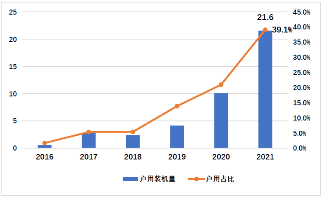 圖2 2016-2021年我國戶用光伏新增裝機情況(GW)