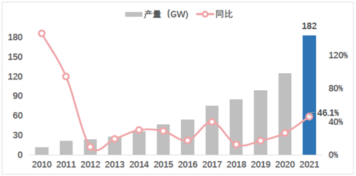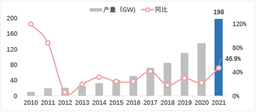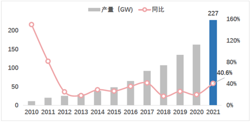 盡管受到供應(yīng)鏈價格波動、外部環(huán)境復(fù)雜嚴(yán)峻和不確定性等不利因素影響,2021年我國光伏制造端規(guī)模仍保持迅速擴大態(tài)勢。2021年,我國多晶硅產(chǎn)量達50.5萬噸,同比增長27.5%,硅片產(chǎn)量約為227GW,同比增長40.6%。電池片產(chǎn)量為198GW,同比增長46.9%,增幅最大。組件產(chǎn)量為182GW,同比增長46.1%。