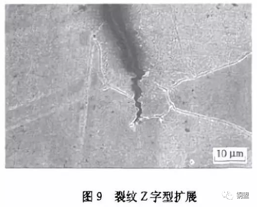在實驗的帶材中,發(fā)現(xiàn)裂紋的擴展除了在鈍化的主裂紋頂端形核、連續(xù)擴展的方式之外,還存在微裂紋在無位錯區(qū)中形核、不連續(xù)擴展(Z字形擴展),如圖9所示。
