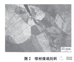 對H68銅合金帶材樣品進行截取、研磨、采用三氯化鐵鹽酸水溶液(配比:6 g FeCl3+10 mlHCl+90 ml水)對其進行腐蝕處理,若黃銅中有β相存在,經此種腐蝕液浸蝕變黑。由金相分析:帶材實驗樣品組織為單相α黃銅,不含有β 相。裂紋缺陷以穿晶為主,如圖2所示,在穿晶過程中有撕裂晶界、沿晶擴展現(xiàn)象,有個別短小裂紋以沿晶開裂及擴展為主。