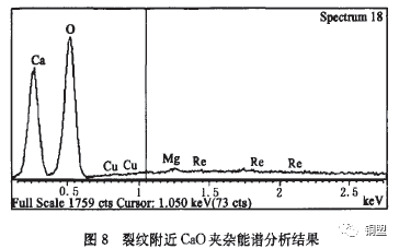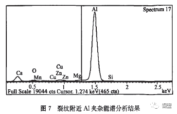 根據能譜分析對缺陷內部及缺陷附近質點的元素進行測定,說明帶材表面含有Al,Al2O3,CaO,SiO2等夾雜,還含有Na,Mg,Ag,K,Fe,S,Cl等雜質元素,部分雜質元素能譜分析結果如圖7、圖8所示??梢姶祟惾毕菔怯捎谠阼T造過程中,夾雜和雜質元素卷入鑄錠皮下或表面,在軋制過程中暴露,由于和基體的變形不協(xié)調產生應力集中,顯微空洞生核、長大、聚集,由于孔洞集聚形成裂紋,空洞長大并和其他空洞連接在一起就形成了韌窩形貌。