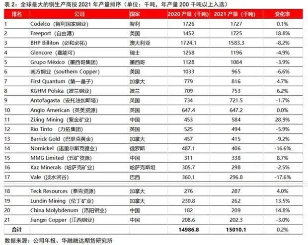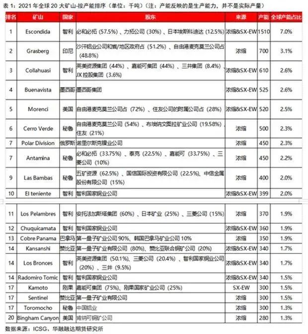 另外進入名單的中國的企業(yè)有紫金礦業(yè)(601899)、五礦資源、洛陽鉬業(yè)(603993)、江西銅業(yè)(600362),2021年銅精礦產量分別為584千噸、338千噸、209千噸和202千噸。