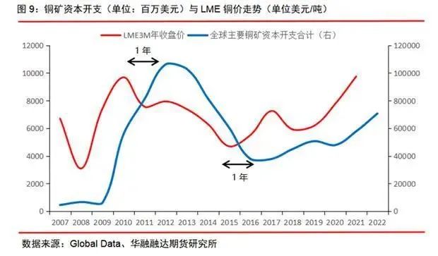 一般而言銅企的資本開支會滯后銅價一年左右見頂和見底,主要原因可歸結于銅企決策一般為結果導向型:如果上一個財年銅價疲軟、經濟下行那么銅企就傾向于在下一個財年縮減開支以減緩財務壓力。相反,如果上一個財年銅價表現(xiàn)強勢、經濟上行那么銅企就傾向于在下一個財年擴張開支以博取更多的回報。