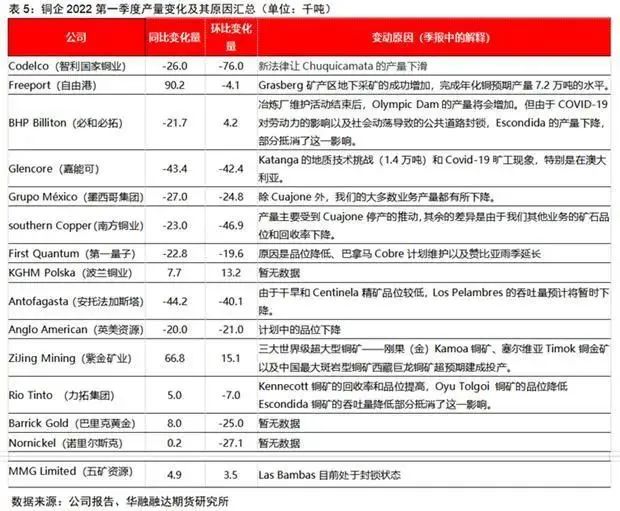 我們統(tǒng)計了19座全球大型銅礦山在2021年及2022年第一季度的產銅情況。重點銅礦在2022第一季度的銅產量合計為1876千噸。同比下降2.8%,環(huán)比下降9.4%。同比減產的主要銅礦有Escondida因為計劃中的品位下降、Collahuasi因為干旱和礦石品位下降。