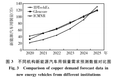 同 時(shí),本 文 將 預(yù) 測(cè) 數(shù) 據(jù) 與全球其 他 機(jī) 構(gòu) 的 預(yù) 測(cè) 數(shù) 據(jù) 進(jìn) 行 對(duì) 比 分 析,其 中,IDTechEx預(yù)測(cè)2025年新能源領(lǐng)域銅需求為120萬(wàn)t,Glencore預(yù)測(cè)值為118.3萬(wàn)t,與本文所得預(yù)測(cè)結(jié)果基本類(lèi)似。本文預(yù)測(cè)結(jié)果符合新能源汽車(chē)領(lǐng)域發(fā)展的客觀規(guī)律,具有一定的參考價(jià)值(表4和圖3)。