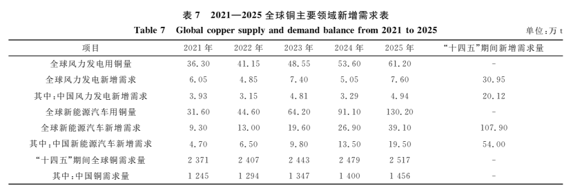 “十四五”期間全球新增銅需求量主要在風(fēng)力發(fā)電設(shè)施建設(shè)(30.95萬(wàn)t)和 新 能 源 汽 車(chē)(107.9萬(wàn)t),截至2025年底,合計(jì)增長(zhǎng)需求量約為138.85萬(wàn)t,平均年度增幅 為29.5%。