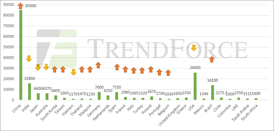 圖:亞太區(qū)2022年光伏新增裝機量需求預測(MW)