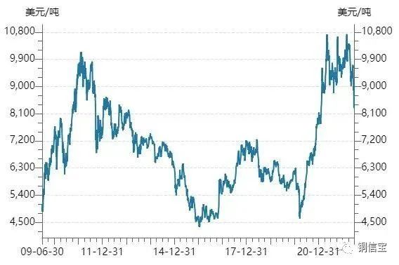 國際銅價連續(xù)下跌兩個多月,調(diào)整時間創(chuàng)出疫情以來最長記錄,調(diào)整幅度也是最近兩年最大的一次,現(xiàn)貨銅價已跌至近16個月低點,但其絕對價格處于2010年以來的高位,相較疫情低點接近翻倍。我們認為,銅價已經(jīng)處于本輪周期的高點,向上空間比較有限,但在下半年需求支撐下,銅價會有反彈行情。