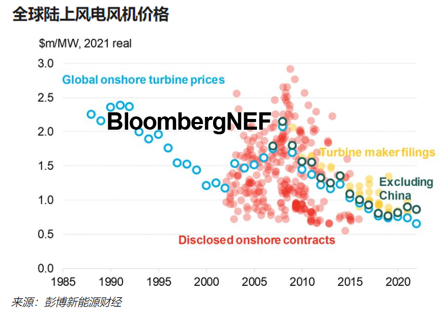中國(guó)與全球其他風(fēng)電市場(chǎng)的定價(jià)差距不斷擴(kuò)大。在中國(guó),得益于開發(fā)商在補(bǔ)貼取消后爭(zhēng)取更低價(jià)協(xié)議、本土供應(yīng)鏈強(qiáng)大且有競(jìng)爭(zhēng)力以及4-5MW更大型風(fēng)機(jī)開始普及,風(fēng)機(jī)售價(jià)已經(jīng)跌至新低,與通脹趨勢(shì)背道而馳。