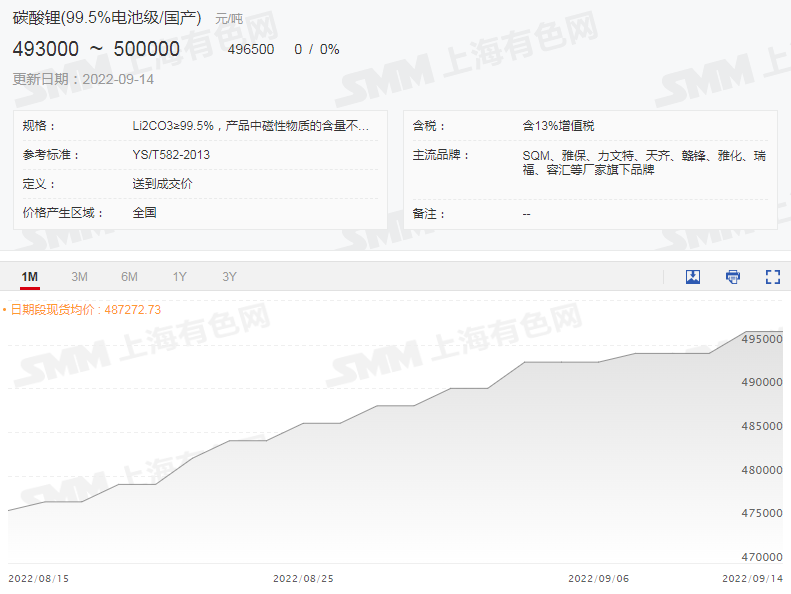 截止9月14日,國(guó)產(chǎn)電池級(jí)碳酸鋰現(xiàn)貨報(bào)價(jià)處于49.3~50萬(wàn)元/噸的價(jià)位,均價(jià)報(bào)49.65萬(wàn)元/噸。