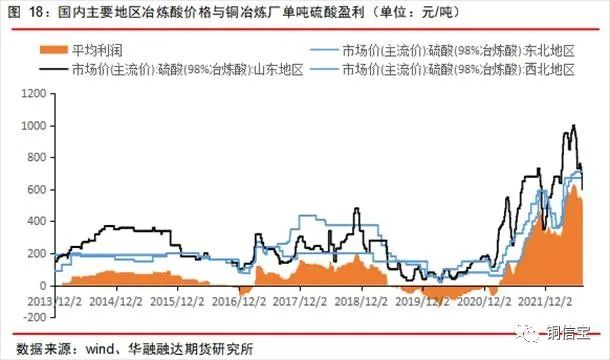 2020年以來,硫酸價格呈現(xiàn)快速上漲趨勢,截至2022年7月14日,東北、山東、西北地區(qū)平均冶煉酸價格約為660元/噸。當前價格下與155元/噸左右的加工成本相比,單噸硫酸凈盈利約為505元/噸。根據(jù)江西銅業(yè)和銅陵有色的數(shù)據(jù)顯示,目前國內(nèi)冶煉一噸陰極銅大概能產(chǎn)出3噸硫酸。這樣來看,銅冶煉廠的副產(chǎn)品硫酸盈利能達到1515元/噸的高位。