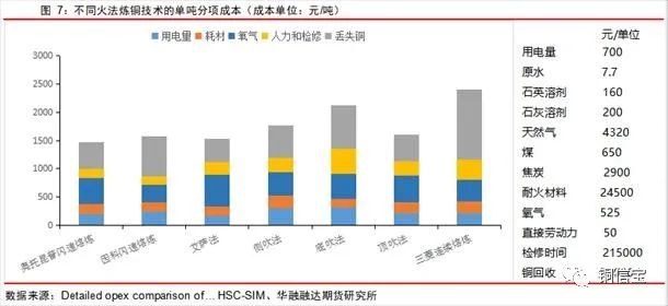 從火法煉銅到陰極銅所產(chǎn)生的成本主要分為五個部分,分別是粗煉成本、電解成本、煙氣制酸成本、渣選礦成本及陽極泥處理成本。其中粗煉成本是最主要的成本構(gòu)成,并且不同方法之間技術(shù)和成本都有較大的差異。