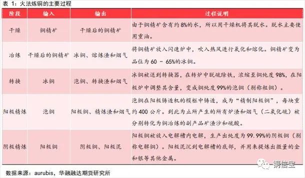 火法冶煉是目前銅冶煉的主要形式。在這個過程中,開采出銅礦在礦場被粉碎、研磨、浮選成含銅量在20-30%的銅精礦,除了銅外,銅精礦中鐵和硫各約占30%,金、銀和其他貴金屬也有微量回收。銅精礦是火法冶煉的原料,然后通過熔煉、吹煉、精煉等環(huán)節(jié)形成陰極銅。更細節(jié)的流程見下表。