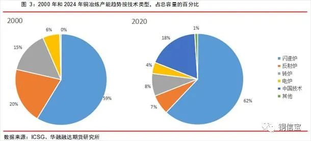 閃速爐在冶煉的過程可以利用硫化物氧化的反應熱進行冶煉,非常的節(jié)能。2000年,閃速/連續(xù)技術(shù)的使用占銅冶煉總產(chǎn)能的59%。到2020年,這一比例上升到65%。反射爐則由于沒有充分利用硫的熱值,而且它們的廢氣中二氧化硫濃度很低,硫酸的回收是不經(jīng)濟的,大氣污染也很嚴重。它的產(chǎn)能占比從2000年的20%下降至2020年的7%。電爐一直被限制在電力非常便宜的地區(qū)占比一直較低。中國的技術(shù)也在迅速擴張,其最高出現(xiàn)在2004年。目前的產(chǎn)能占比約為18%。