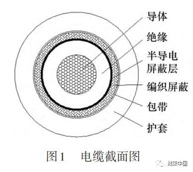 電纜設(shè)計時通常采取的屏蔽組合為鋁塑復(fù)合帶+銅絲編織的復(fù)合屏蔽結(jié)構(gòu),但是鋁塑復(fù)合帶容易氧化碎裂,壽命短,碎裂后會急劇降低屏蔽性能。為了改善這一情況,新設(shè)計的電纜采用編織屏蔽層包覆在半導(dǎo)體屏蔽層上的方式?(電纜截面如圖?1 所示),將繞包鋁塑復(fù)合帶更改為擠出半導(dǎo)電屏蔽層,在保證良好屏蔽性能的基礎(chǔ)上,使電纜各部分的壽命達到一致,充分滿足新能源汽車對于各零部件的壽命要求。