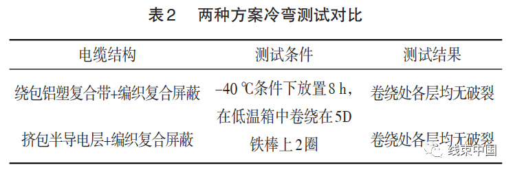 因汽車內(nèi)部的空間有限,布線的空間非常狹小,轉(zhuǎn)角半徑也小,柔軟性更好的電纜在整車廠裝配時更容易施工,方便客戶生產(chǎn),客戶的產(chǎn)能也將更高。本文中所提到的“雙層共擠”的方式,不用多增加一道工序,同心度也能一起管控,減少了成品外徑,提高產(chǎn)品質(zhì)量,電纜整體的柔軟性也比傳統(tǒng)的繞包鋁塑復(fù)合帶方式生產(chǎn)的電纜好,整體性能及客戶使用方便性更強。兼顧了產(chǎn)能和質(zhì)量控制的雙重要求。兩種方案冷彎測試對比如表2所示。