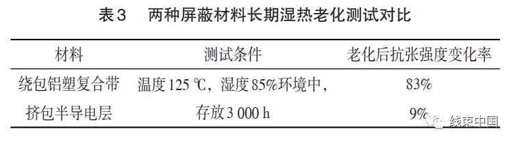 兩種屏蔽材料長期濕熱老化測試對比如表?3 所示。經(jīng)過測試結(jié)果對比發(fā)現(xiàn),鋁塑復(fù)合帶在潮濕、高溫、酸堿、鹽霧等情況下,老化速度加快。材料變得極度脆弱,有彎折或有外力的作用下,就會破碎,使之處于失效狀態(tài),降低整體的屏蔽效果。從而嚴重影響電纜整體的壽命。