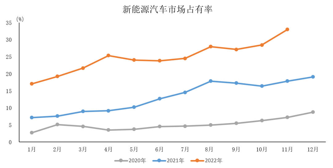2022年11月,新能源汽車產(chǎn)銷分別完成76.8萬輛和78.6萬輛,同比分別增長65.6%和72.3%,市場占有率達到33.8%。