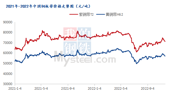 據(jù)Mysteel調(diào)研顯示,2022年中國主流牌號紫銅板帶T2價格在60940-81420元/噸區(qū)間運行,全年均價較2021年下跌600元/噸左右,其中全年最低價格出現(xiàn)在7月份到達60900元/噸,H62黃銅帶全年最低價格到達49590元/噸,2022年因宏觀因素美聯(lián)儲大幅加息導(dǎo)致電解銅價格大跌從而令銅板帶價格下跌,同時受基本面影響,疫情方面物流運輸受阻,部分生產(chǎn)企業(yè)和終端產(chǎn)業(yè)停工停產(chǎn)使銅板帶消費下滑,或?qū)⑹广~板帶價格下跌,顧名思義,銅板帶價格是以原材料價格+加工費的模式,我們調(diào)研了主流牌號加工費,2022年普通帶材T2紫銅帶加工費5100-5400元/噸區(qū)間震蕩,同比漲幅1.9%,H62黃銅帶加工費2800-3900元/噸運行,同比跌幅11.84%。由于黃銅板帶主要應(yīng)用領(lǐng)域是裝飾服輔等制造業(yè)方面,由于市場消費低迷,導(dǎo)致黃銅板帶優(yōu)勢不在,各個企業(yè)為了薄利多銷出現(xiàn)壓價情況,促使黃銅板帶加工費回調(diào),相反,由于新能源領(lǐng)域、電力方面加持使紫銅以及高精度板帶消費增長,紫銅板帶加工費略增。