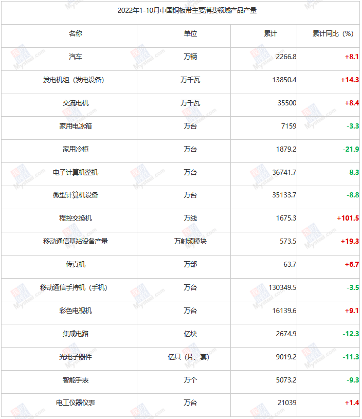 從銅板帶消費領(lǐng)域來看,其中電子通信領(lǐng)域;2022年我國集成電路累計同比下滑12.3個百分點,集成電路產(chǎn)量的下滑對我國高精銅板帶的生產(chǎn)用量大幅減少,2022年我國手機和計算機分別累計同比下降3.5個百分點和8.3個百分點,作為連接器的第二大下游手機和計算機產(chǎn)銷同比下滑促使連接器行業(yè)產(chǎn)銷下降,進而板帶用量在電子需求萎縮,然而移動通信基站設(shè)備產(chǎn)量累計同比增長19.3%,整體來看電子通信領(lǐng)域是下滑的。制造業(yè)領(lǐng)域;房地產(chǎn)市場消費的低迷建筑裝飾行業(yè)需求不振,裝飾材料、燈具等需求減弱,導(dǎo)致黃銅、白銅、紫銅板帶元件消費持續(xù)減少。2022年我國家電產(chǎn)量累計同比增長拉動開關(guān)插座市場維穩(wěn)但難見繁榮景象。汽車領(lǐng)域:汽車和新能源領(lǐng)域消費一枝獨秀,刺激銅板帶連接器需求旺盛,新能源汽車行業(yè)維持同比近99.23%的速度增長,充電樁需求大量的電子連接器件,從而拉動對銅板帶需求。?電力領(lǐng)域;2022年我國電源基建投資同比增長25.1%,電氣方面的電纜帶(紫銅帶和無氧銅帶)需求增長但變壓器銅帶需求量增長不明顯,