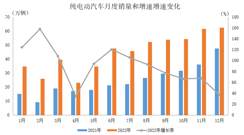 2022年12月,新能源汽車產(chǎn)銷繼續(xù)保持高速增長,再創(chuàng)歷史新高,分別達(dá)到79.5萬輛和81.4萬輛,同比均增長51.8%。
