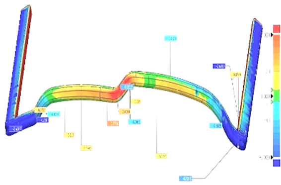 躍科在模具設計時,會根據(jù)以上幾個因素,對銅線的成型過程進行分析和仿真模擬,并結合大量應用經驗設計出最合理的模具輪廓,得到最精確的線型尺寸,線型整體輪廓度可達0.1~0.2mm。