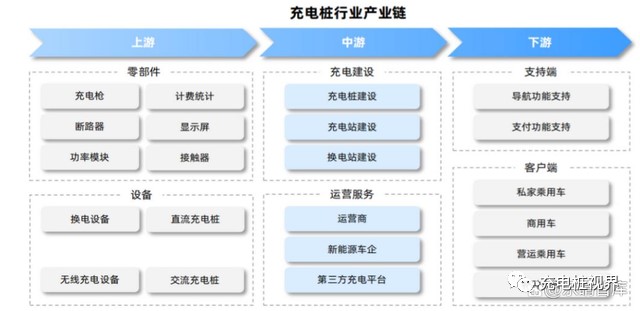 充電樁上游是設(shè)備元器件制造,中游為充電樁制造和運營,下游為整車廠和充電方案解決商。